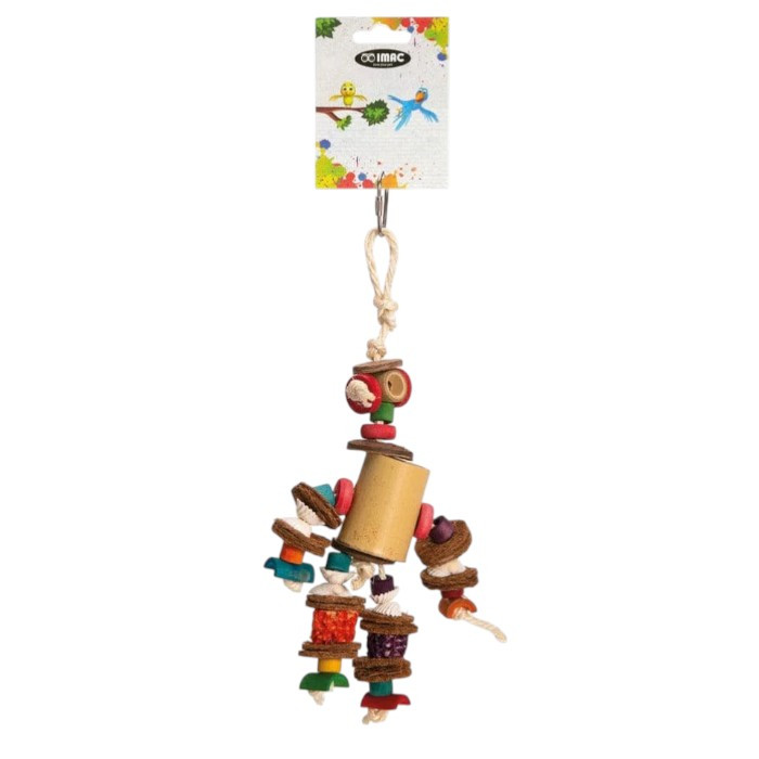 Ručno izrađena drvena igračka dizajnirana za ptice, napravljena od održivog bambusa i drveta. Podstiče žvakanje, kljucanje i igru, podržavajući zdravlje kljuna i mentalno obogaćivanje u ekološki prihvatljivom dizajnu.