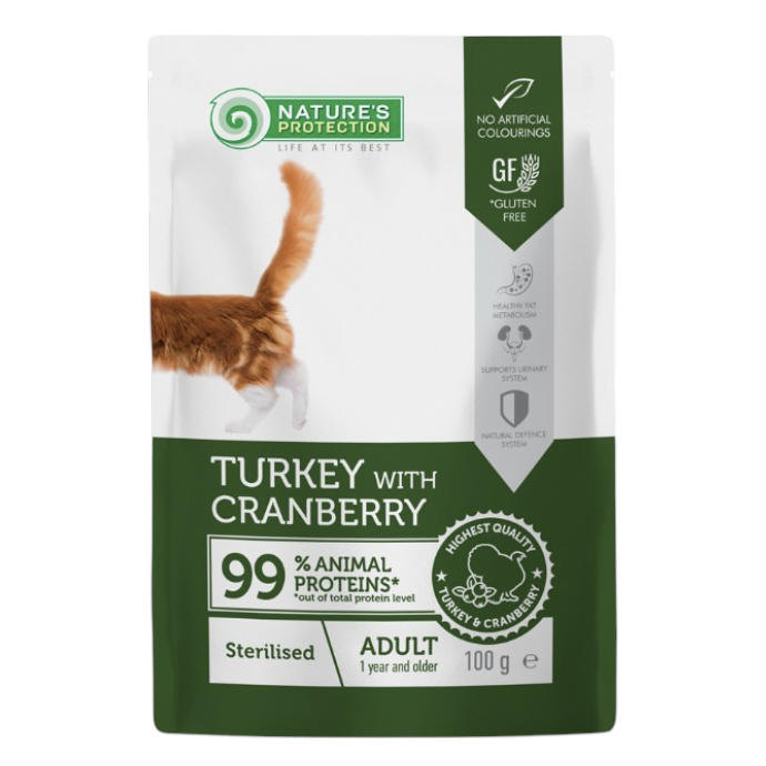 Nature's Protection 100 gr je vlažna hrana za sterilisane mačke. Formulisana je sa prirodnim sastojcima, kao što su ćuretina i brusnice, koji obezbjeđuju uravnoteženu i ukusnu ishranu za vašu mačku.