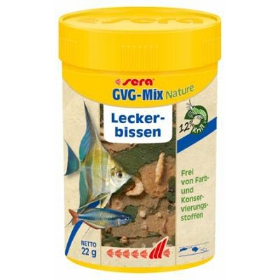 Sera GVG-Mix Nature je prirodna poslastica napravljena od nježno proizvedenih pahuljica, koja ne sadrži nikakve boje niti konzervanse. Mješavina pahuljica i sušenih životinja, kao što su kril, licinke crvenih komaraca i dafnija, omogucuje raznoliku prehranu. Hrana je posebno bogata prirodnim mineralima i elementima u tragovima te potice dobro zdravlje i plodnost. Dimenzionalno stabilne pahuljice prikladne su za sve ukrasne ribe koje jedu površinu i ne omekšavaju vodu.