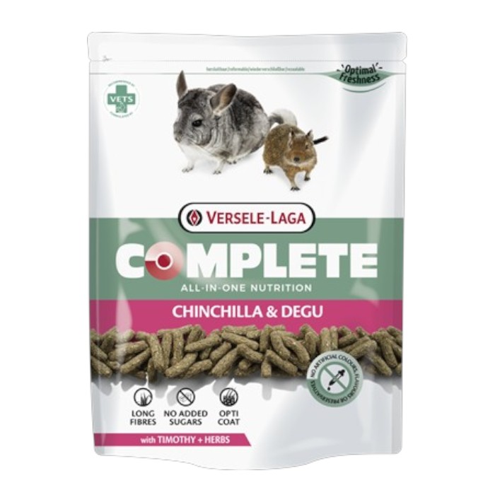 Versele-Laga Complete Chinchilla & Degu je prehrana bez brige. Izuzetno ukusne sve-u-jednom pelete izbjegavaju selektivno hranjenje. Na taj način vaša činčila ili degu dobijaju sve esencijalne hranjive tvari i ostaju savršeno zdravi. Hrana bez dodanih šećera održava životinje vitalnima i u optimalnom stanju. Laneno sjeme kao izvor omega-3 za zdravu dlaku i duga vlakna za optimalnu probavu, posebno su prilagođeni nutritivnim potrebama činčila i degua. Versele-Laga Complete Chinchilla & Degu razvili su veterinari, na osnovu naprednih naučnih saznanja.